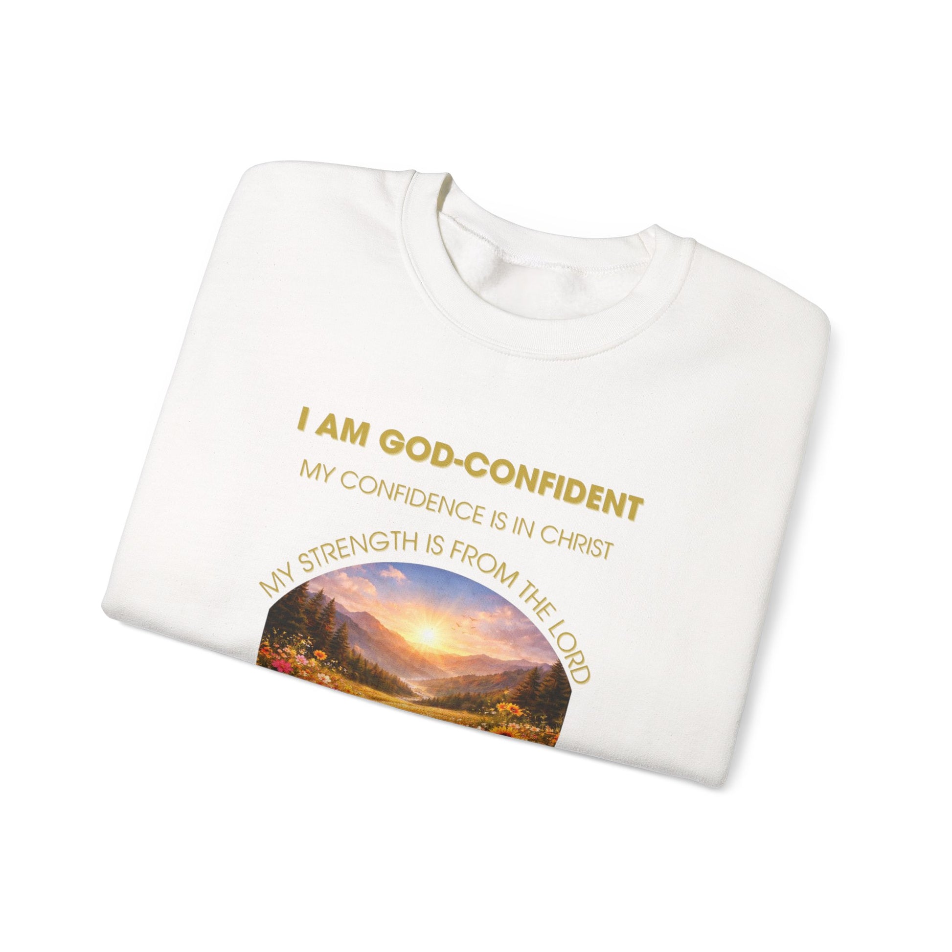 Christian Crewneck Sweatshirt Phil. 1:6— "I Am God-Confident" Inspirational Scripture Design. This soft, medium-weight crewneck brings a quiet confidence to everyday wear. A serene landscape print sits beneath uplifting scripture-style text on the front, with a reflective passage printed across the back—designed to feel like a gentle reminder you can wear. The tubular knit construction and ribbed collar keep the shape while the 50/50 cotton-poly blend (with Heather Sport color variants) feels warm without weighing you down. Subtle embroidery options let you personalize placement, and DTF inner neck labels keep the interior clean and comfortable. Ethically sourced cotton and OEKO-TEX dyes make this sweatshirt a thoughtful choice for those who value both comfort and conscience.